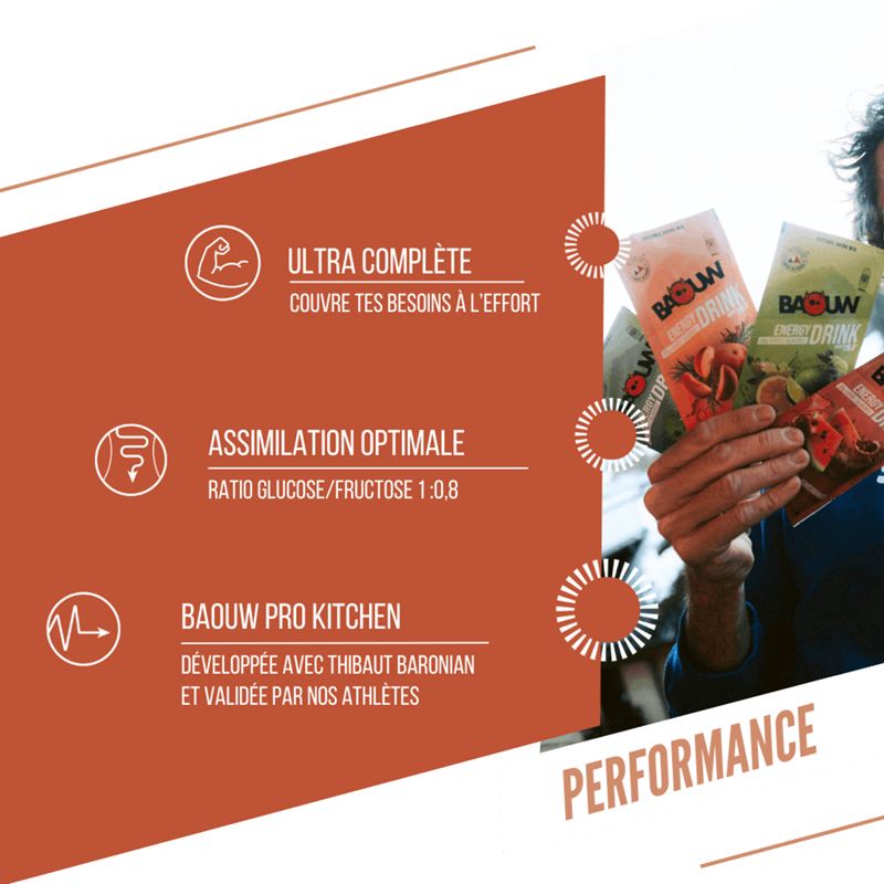 - Énergie : 38g de glucides + vitamines + 100mg de taurine