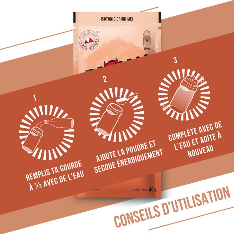 1 sachet individuel de 45g à diluer dans 500ml d’eau par heure. A adapter selon l’intensité de l’effort, tes habitudes et ton gabarit.
