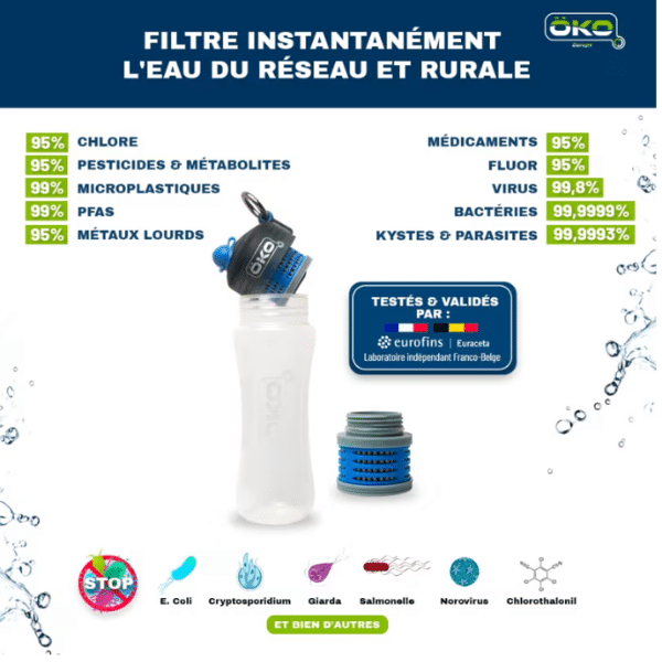 La gourde filtrante ÖKO est une solution innovante pour obtenir de l’eau potable en toutes circonstances, que ce soit au quotidien, en voyage ou lors d’activités en plein air.